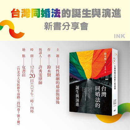 𝟏𝟐/𝟐𝟎 𝐒𝐚𝐭.【同性婚姻的幕前與幕後──《台灣同婚法的誕生與演進》新書分享會】
